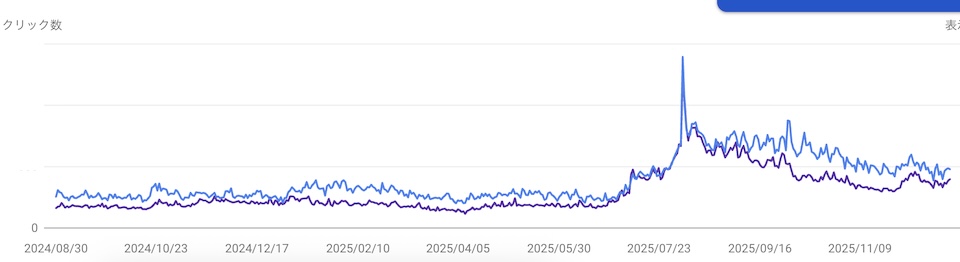 2025年6月のアップデートでやや検索流入数が持ち直し、2025年8月にはなぜか超バズ!して検索流入が激増!