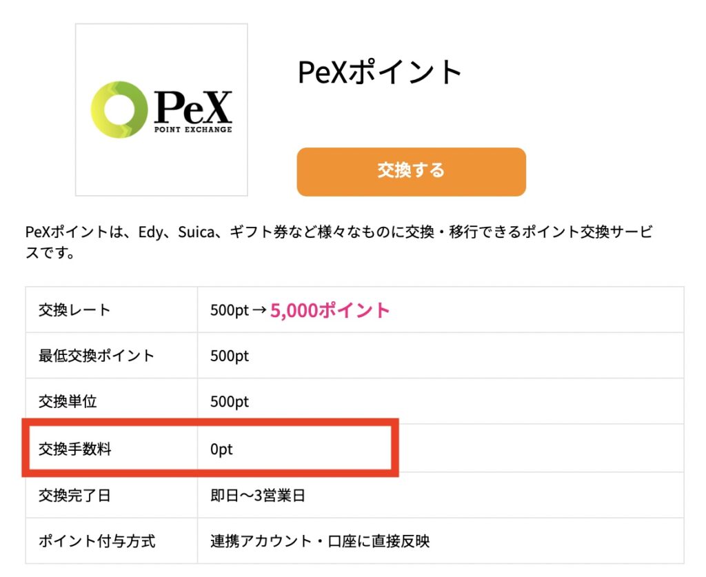 1回あたりの交換ポイントは1,000,000PeXポイント=100,000円分が上限ですので、大量ポイントを1回に交換すれば、50円程度の手数料ならほぼ気にならない水準です。