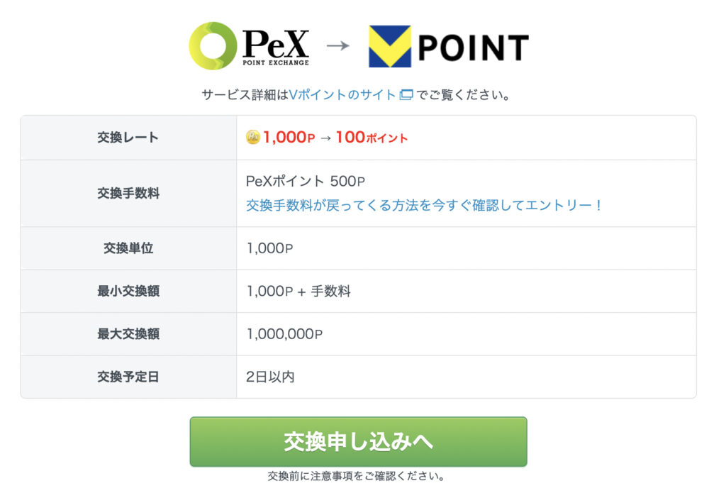 さらに、PeXさんでは常設キャンペーンとしてPeXからVポイントへの交換手数料が月1回無料になるキャンペーンを展開しています。