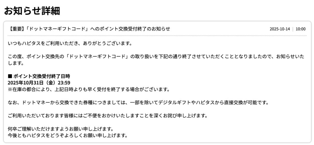 ということで、なんとハピタスさんからドットマネーへの直接交換ルートが2025年10月末で終了します(笑)。