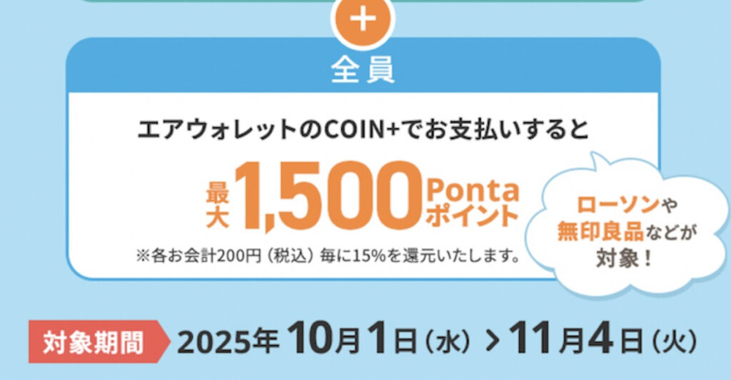 さらに、エアウォレット支払いで15%還元(最大1,500円)ですので、対象店舗で10,000円決済すればさらに1,500円・・。