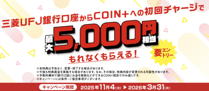 キャンペーンにエントリーした上で、三菱UFJ銀行からの初回チャージ額が30,000円以上で、5,000円相当のCOIN+残高がもらえます。