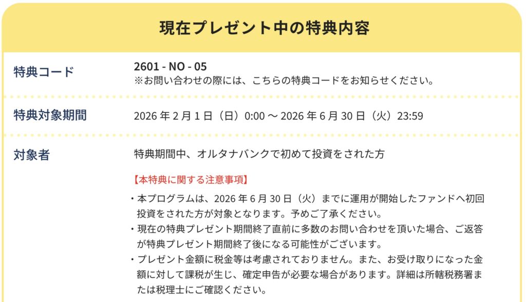 上記、特典対象期間である2025年10月1日(水)〜2026年1月31日(土)の間に、オルタナバンクで初めて投資した方全員が対象になります。