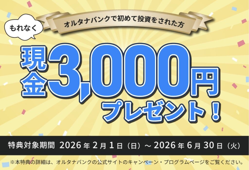 オルタナバンク側の新規口座開設キャンペーンも実施中でして、実投資することで3,000円分の現金がもらえます。
