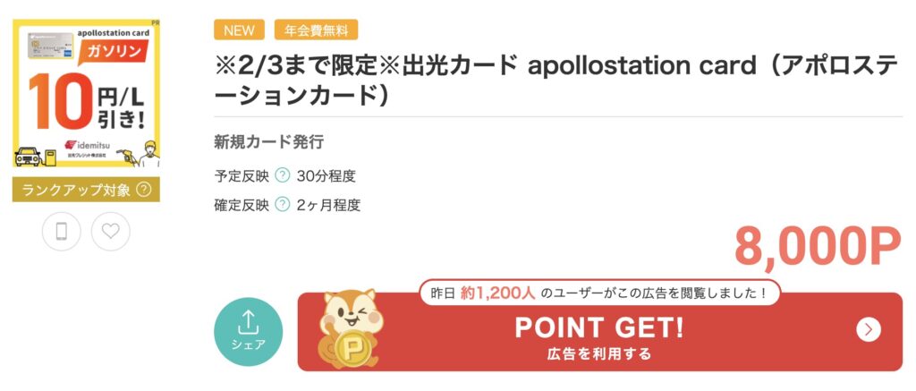 年会費無料!の出光一般カード(apollostation card)のポイントサイト案件が・・。