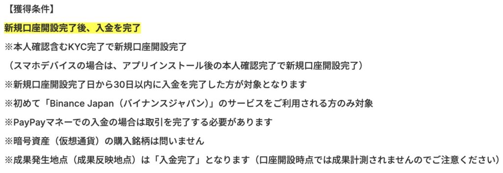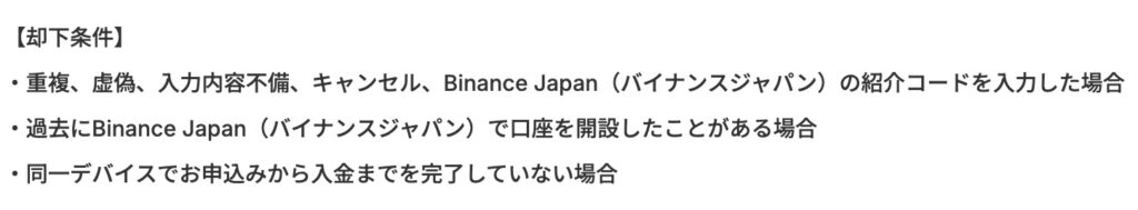 Binance Japanで口座開設したことがある場合、紹介コードを入力した場合、また同一デバイスでお申し込みから入金までを完了していない場合は対象外になるのでご注意を。