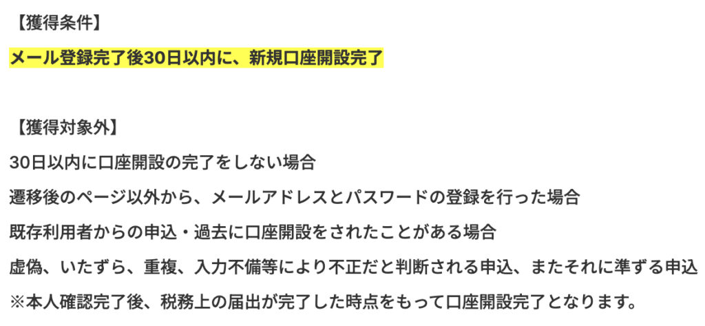 全く難しい条件はなく、メール登録完了後30日以内に新規Web口座開設完了で成果条件達成です。
