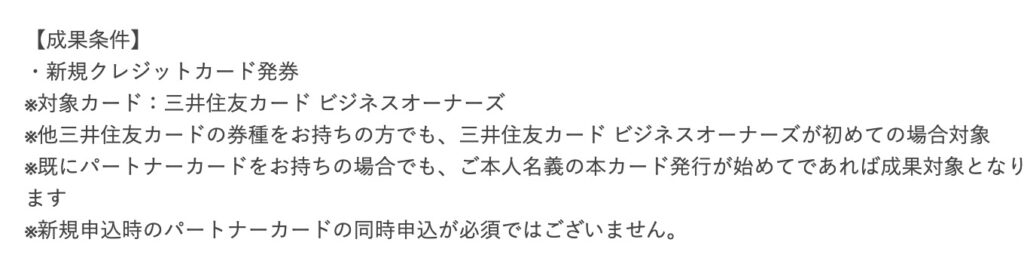 すでにこの「三井住友カード ビジネスオーナーズ」の前身のカードとなる「三井住友ビジネスカード for Owners」を所有したことのある方と当然ながらこの「ビジネスオーナーズ」を発行したことのある方は、対象外となります。