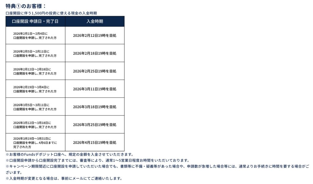 2026年3月31日までに口座開設申請し、4月6日までに口座開設を完了した方に、そのまま投資に使える資金1,500円をプレゼント・・と書かれています。