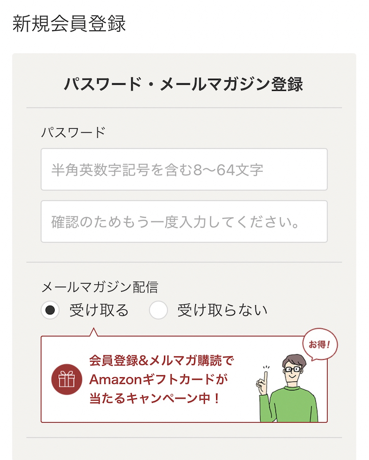 なお、メルマガ登録はポイント獲得条件にはないので、購読する必要はありませんが・・なんかメルマガ登録しておくとAmazonギフトが当たるキャンペーン中らしいので、受け取るにしておきました。