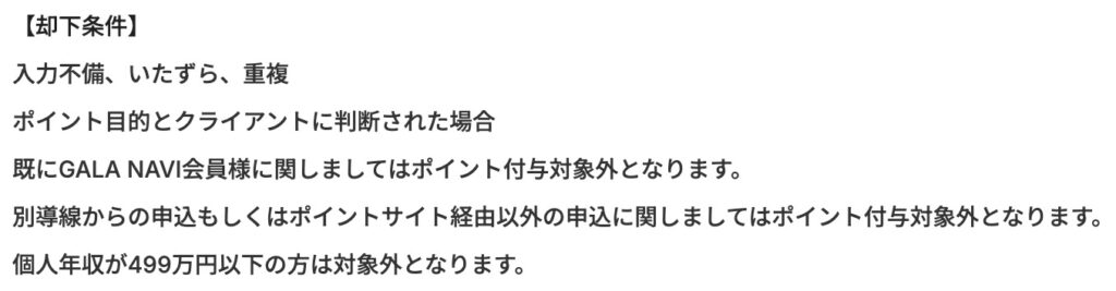 ただ、ポイント対象外条件がちょっと微妙でして・・「GALA・NAVI」への登録が初めてってことは当然として・・。