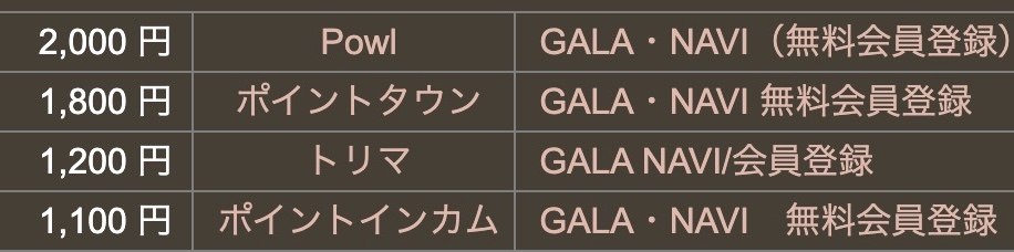 そして、このGALA NAVI案件ポイントサイトにはいつも紹介されている案件ですが、普段は大体もらえても1,000円くらいってのが相場の中、なんと、2,000円水準が登場しています!