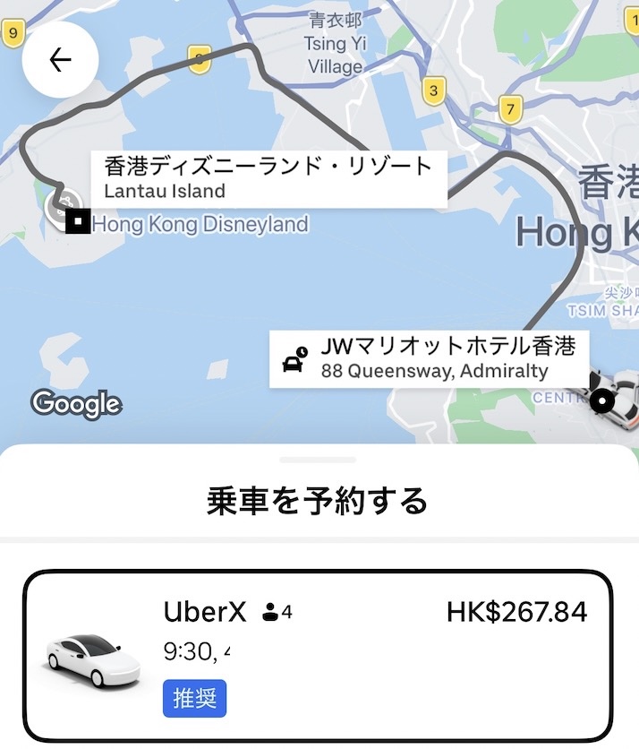 ということで、宿泊しておりましたJWマリオットホテル玄関にUberを手配し、颯爽と香港ディズニーランドに向かってまいります。