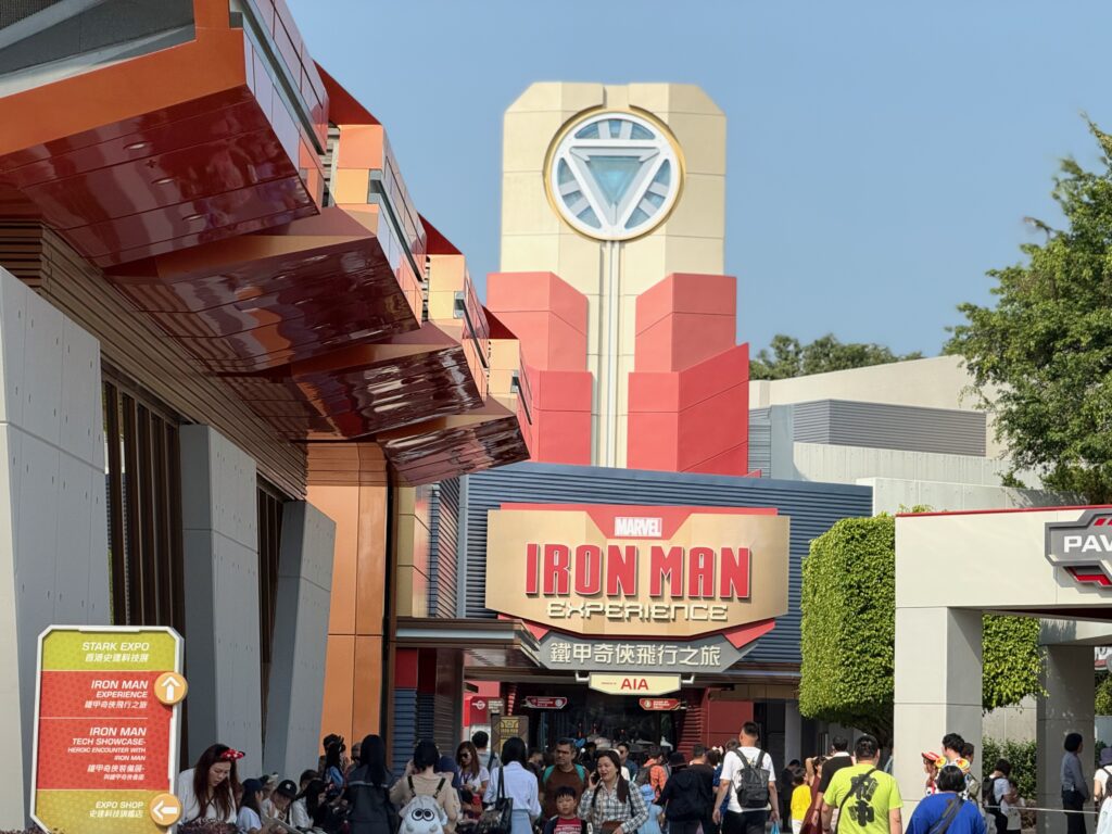 子どもたちはアイアンマンに送り出しました。アイアンマンはほんとめちゃくちゃ回転の良いアトラクションとして有名で、基本5分ですね。
