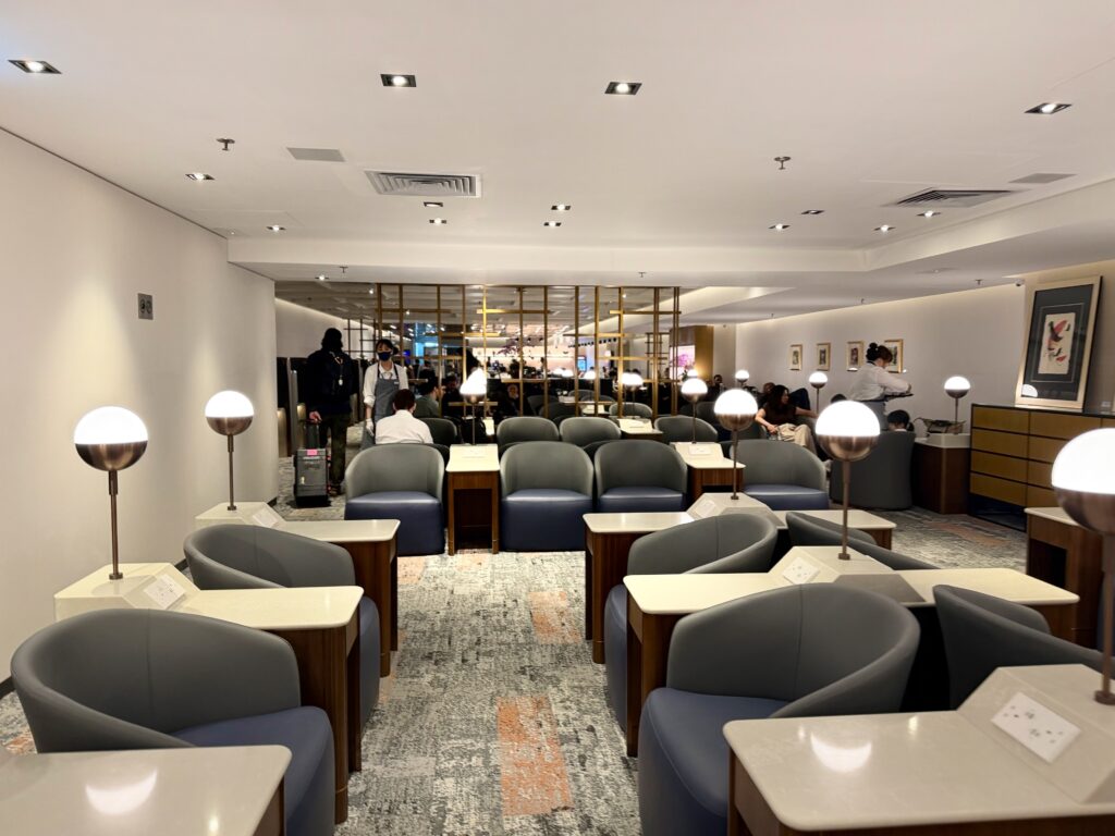 まず、ラウンジはこのように縦長のラウンジになっています。こちらは一番奥まった座席ですね。入り口方面の写真奥に、バーカウンターやフードカウンターがあります。