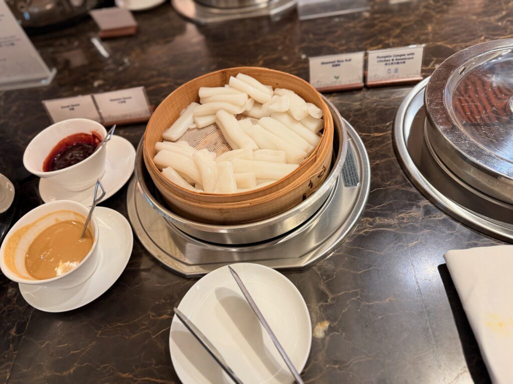香港の朝食では一般的な・・米粉を蒸したものですね。味はついていないので、左に見えるタレなどをかけていただきます。