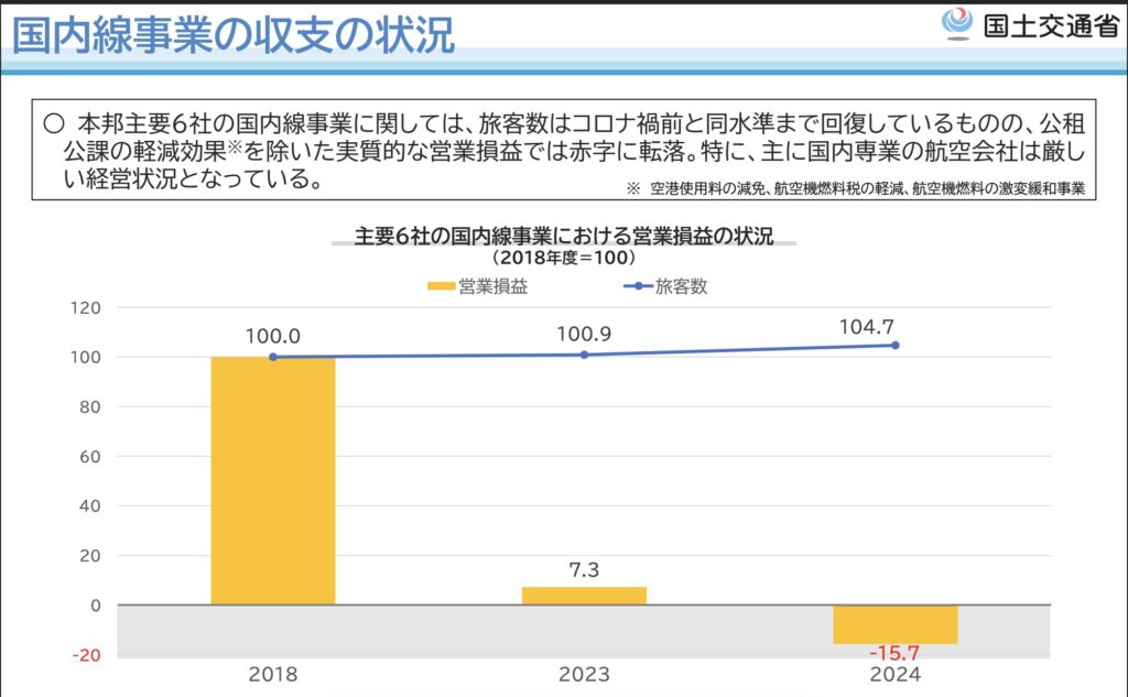 JALさん以外も含めた国内主要6社(JAL、ANA、スカイマーク、AirDo、ソラシドエア、スターフライヤー)の国内線事業は、国からの支援を除いた実質的な営業損益は赤字なんです。