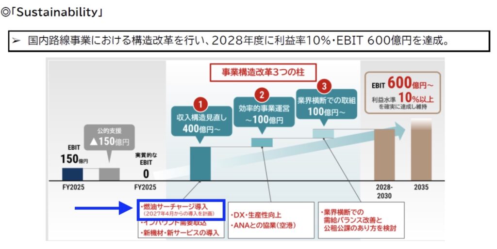 国内路線事業における構造改革の一環として、2027年4月からの燃油サーチャージの導入を計画・・と記載されています。