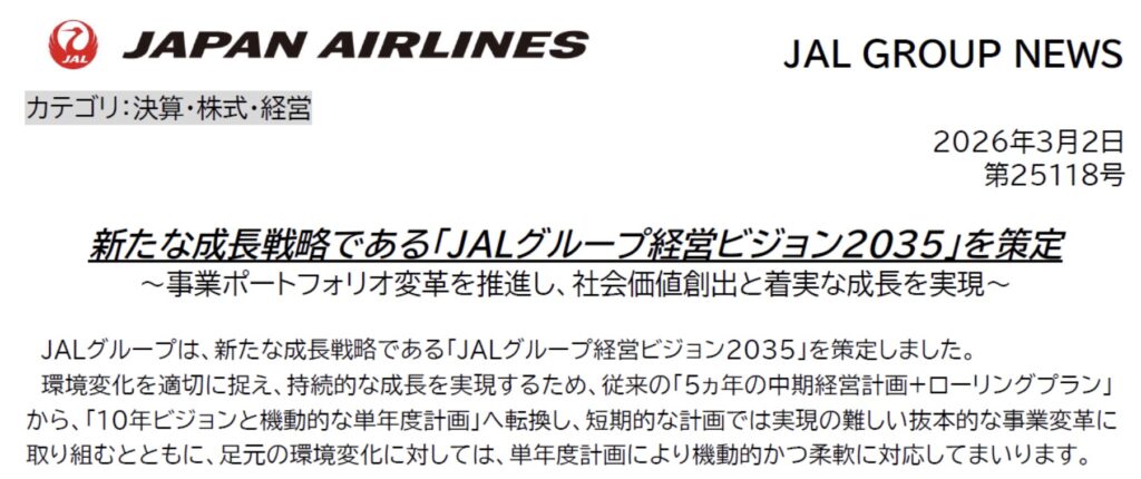 2026年3月2日に発表された「JALグループ経営ビジョン2035」で公表されました。