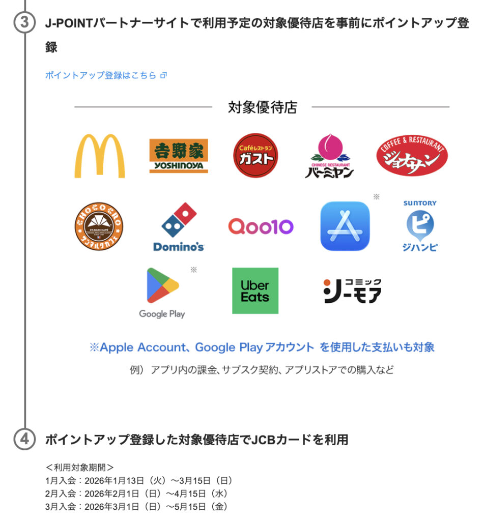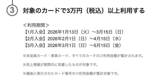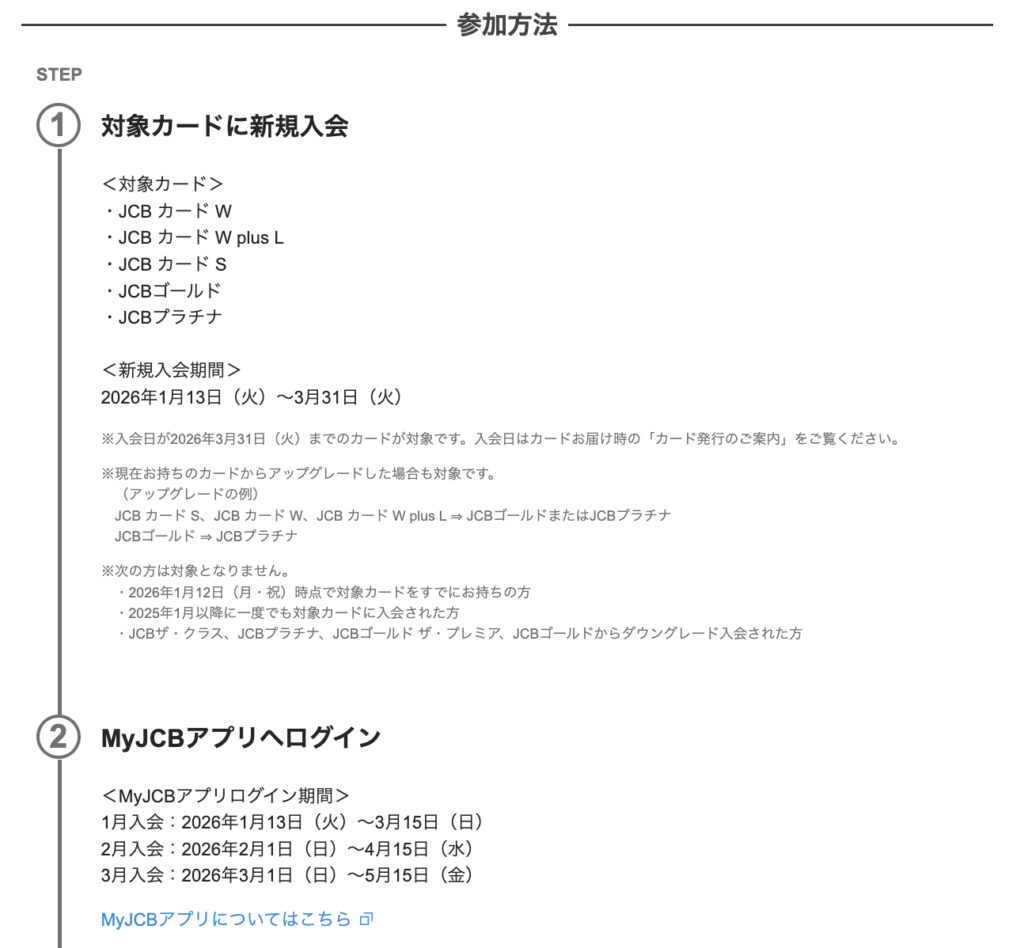 いずれも、期間内にMyJCBログインする必要がある&カード入会月翌々月15日までの利用が必須なのでご注意を。