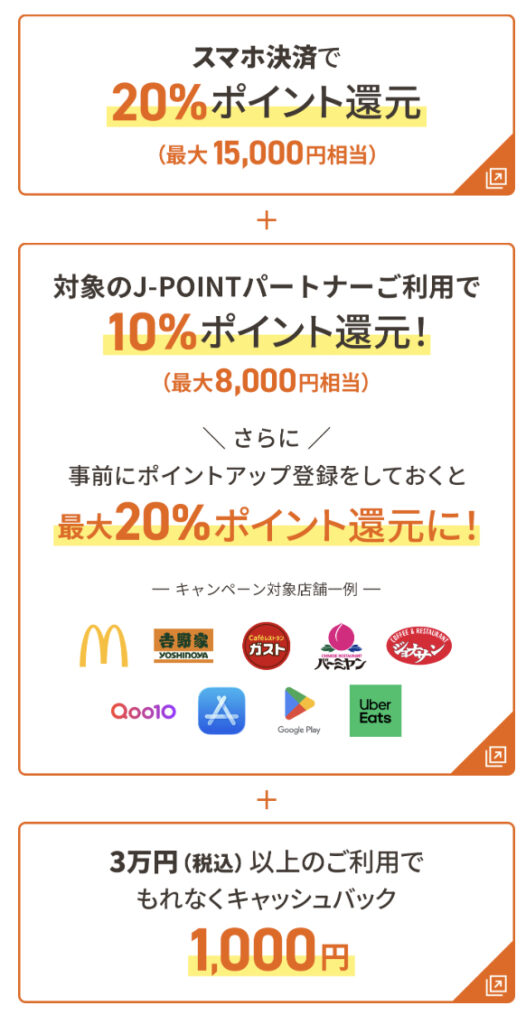 これ、正直、「スマホ決済15,000円」「J-ポイントパートナー利用8,000円」「3万円以上決済で1,000円」・・いずれもかなり簡単なので、サクッ24,000円はもらえると思います。