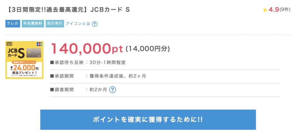 ポイントサイトのJCBカードS案件がこちらですね。