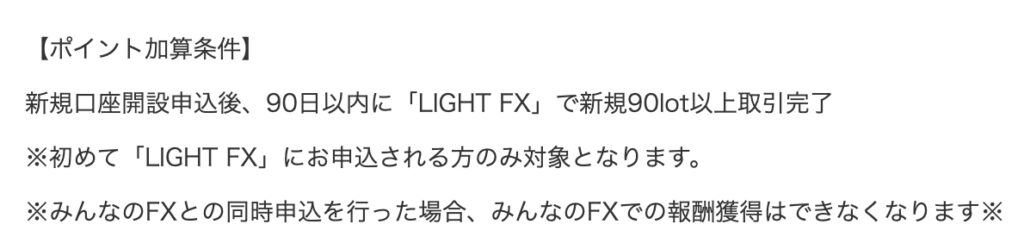そして、これ超朗報ですが、なんと「みんなのFX」「みんなのシストレ」の口座開設済みであっても、この「LIGHT FX」の口座開設が初めてであれば、ポイント獲得対象になります。