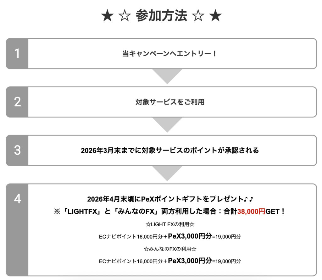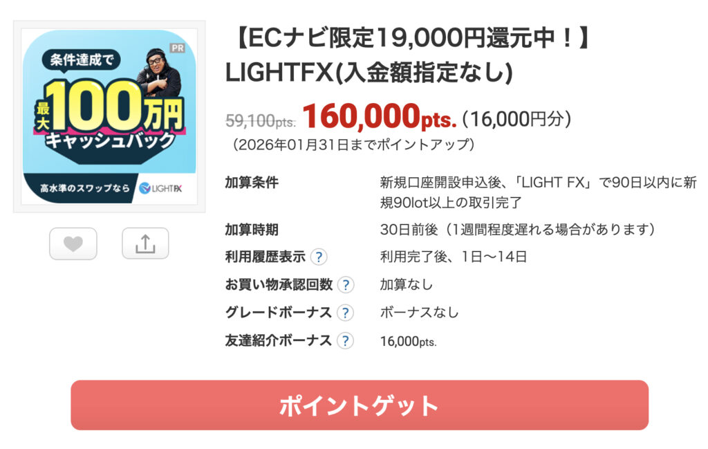 ECナビさんのLIGHT FX「19,000円」案件はこちらから利用できます。必ずこちらからキャンペーンへのエントリーをお忘れ無く。