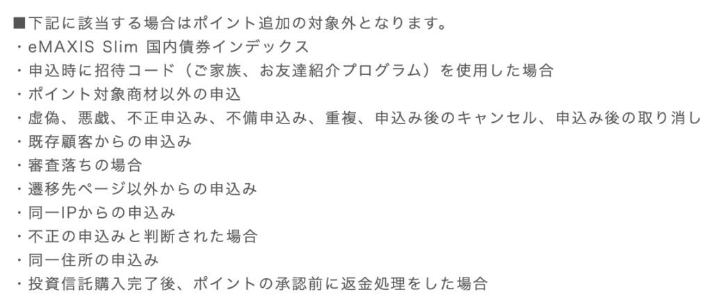 特に注意が必要なのが・・投資信託購入後、ポイント付与前に返金処理をした場合はNGなので・・購入した投信は、ポイント承認まで売ったり出金したりせず持っておきましょう。