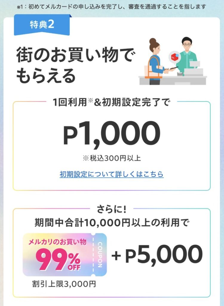 メルカード発券後初期設定(笑)&街のお店などでメルカードまたはメルペイのあと払いを利用(1回300円以上)することで・・。