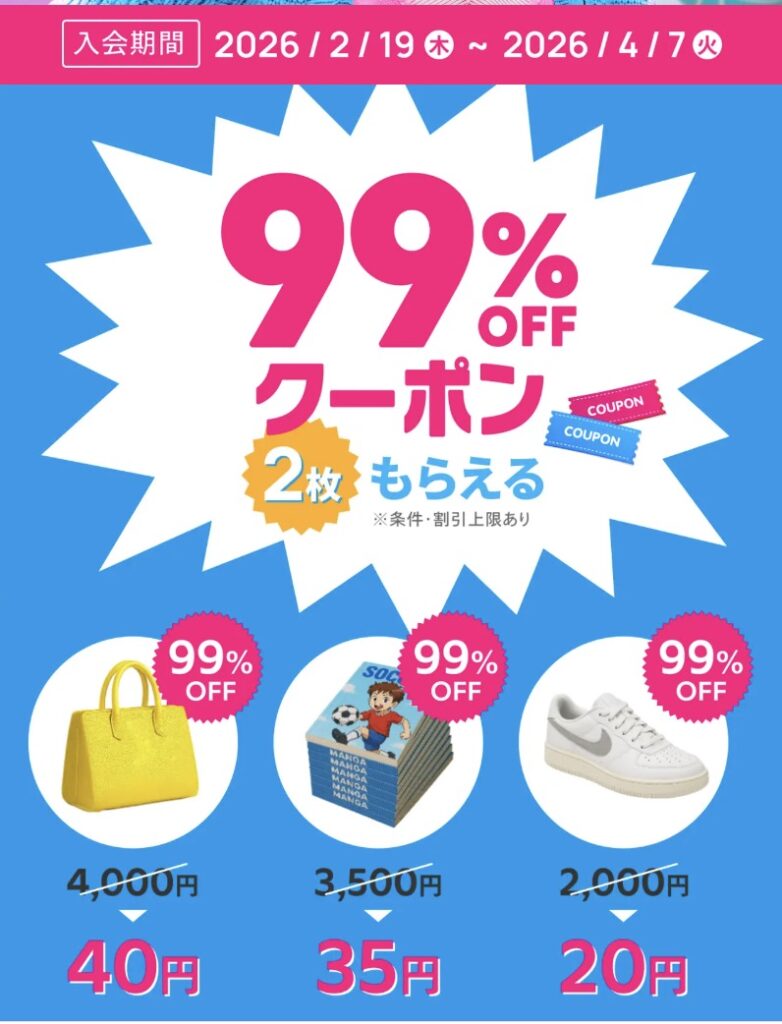 99%オフクーポンだけでも割引上限7,000円分あり、さらにメルカリポイント6,000円分(通常特典1,000P+10,000円利用で5,000P)もらえるので・・。