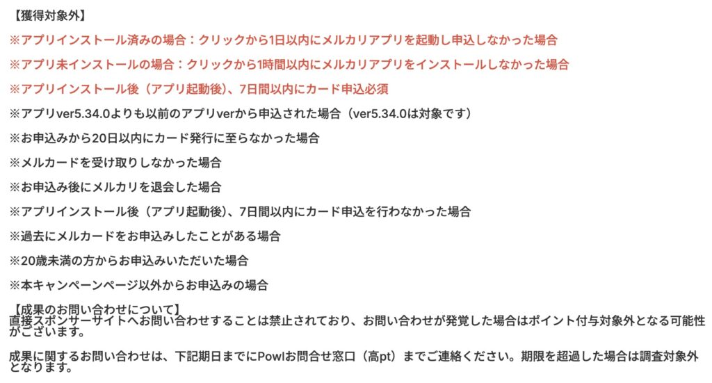 メルカードの発券が初めてで、かつ、広告クリック→アプリ起動から7日間以内にカード申し込みを行い、20日以内に無事カードが発券されれば、それでOKです。