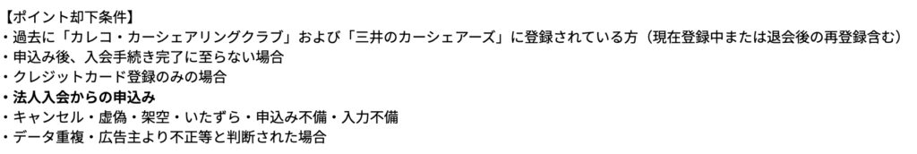過去に「カレコ・カーシェアリングクラブ」および「三井のカーシェアーズ」に登録している方は対象外ですので、この点だけはご注意を。