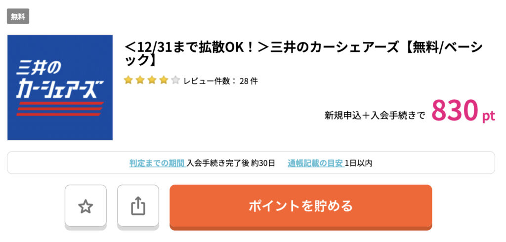 三井のカーシェアーズ案件がこちらですね。無料会員登録だけで830円分のポイントがもらえます。