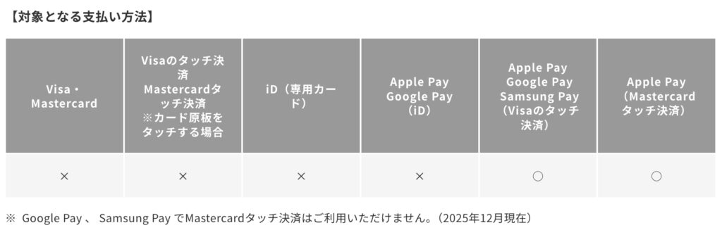 必ずApple PayかGoogle Payに登録して、スマホのVISAタッチ決済が必要になります。iD決済は対象外ですのでご注意を。
