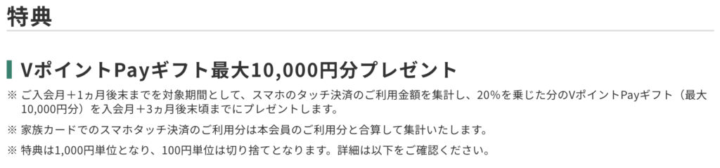 スマホのタッチ決済のご利用金額を集計し、20%を乗じた分のVポイントPayギフトが、入会月+3ヵ月後末頃までにプレゼントされます。