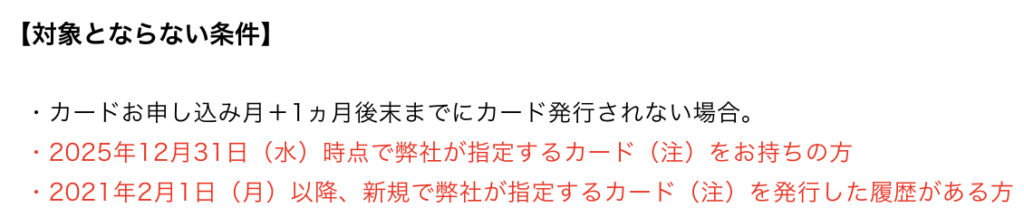 さらに、2021年2月1日以降新規で同じく三井住友カードが指定するカードを発行した履歴がある方は、対象外となるんです。