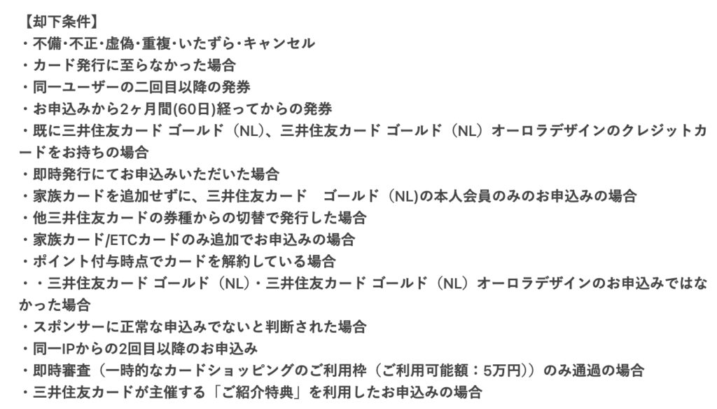 難しい条件は一切ありませんが、「三井住友カード(NL)一般カードからのランクアップ(アップグレード)」での発券の場合、ポイント獲得対象外となるので注意してください。