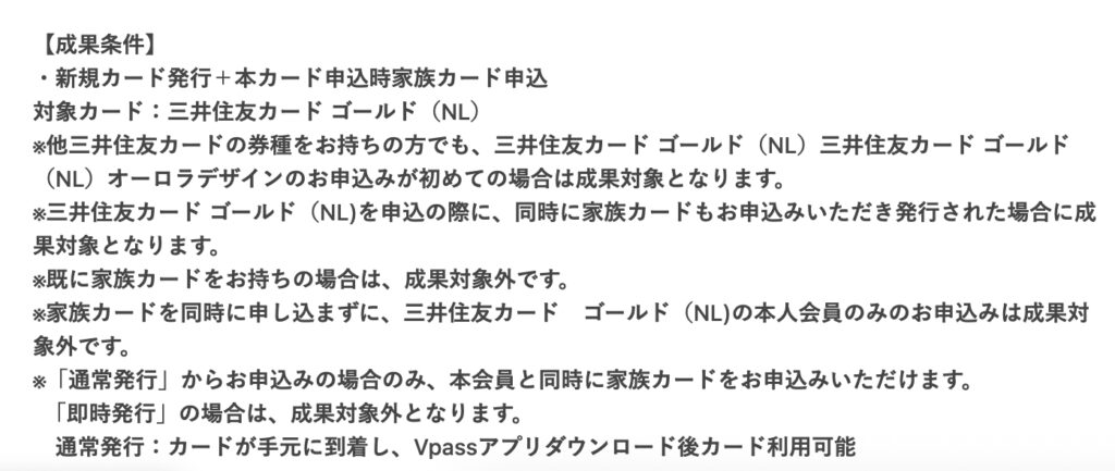 まず、獲得条件は繰り返しですが「三井住友カードゴールド(NL)」を新規に発行&家族カードを同時申込した方ということになります。