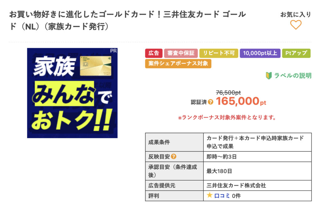 では、まずはこの三井住友カードゴールド(NL)案件の、ポイントサイト案件としてのお得度から確認していきましょう!!