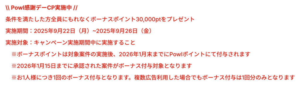 あ、ボーナスポイント3,000円分は、2026年1月末までに別途Powlポイントにて付与されます。