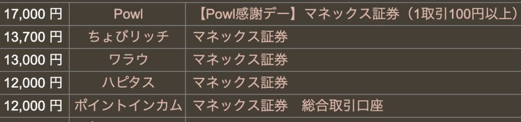そして、このマネックス証券案件の口座開設でおすすめなのが・・最高還元を叩き出しているPowlさんですね。