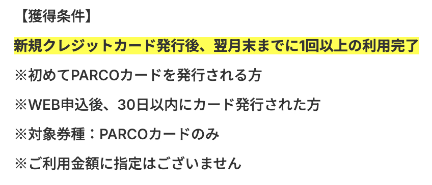 まず、ポイント獲得条件ですが、新規カードの発券&カード受取+翌月末までに1回以上の利用完了となっています。