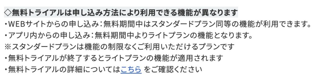 ちなみに、後述しますが無料トライアル期間中はWEBサイトからの申し込みに限り、ライトプランでも無料期間中はスタンダードプラン同等の機能が利用できます。