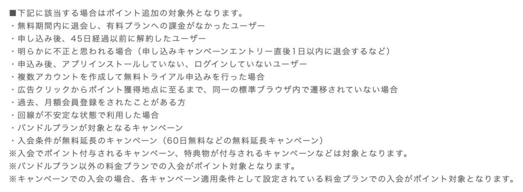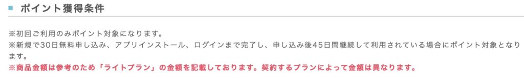 初回利用時には30日間の無料期間が付帯するのですが、45日間継続利用・・つまり1ヶ月分の課金でポイント対象です。