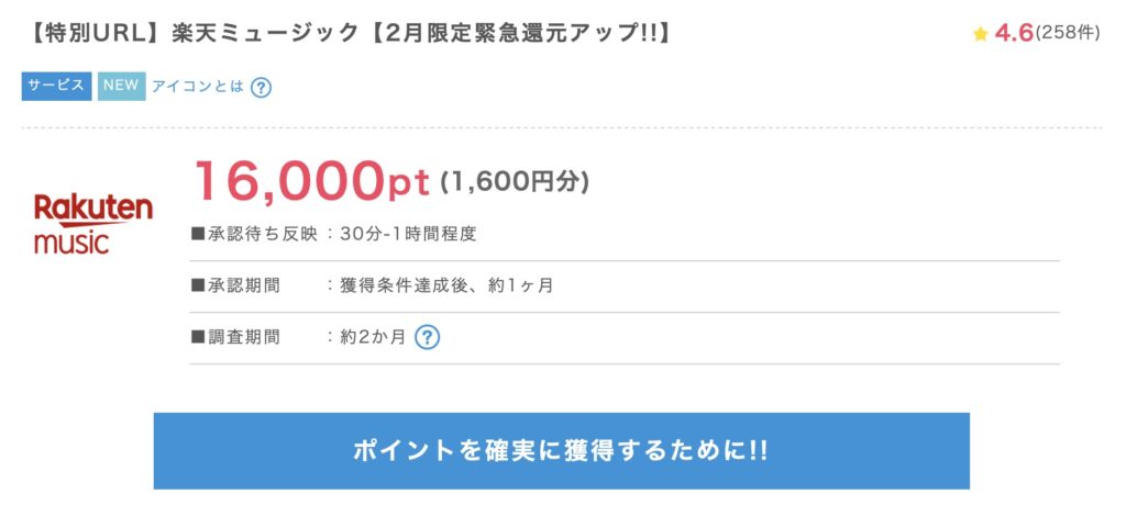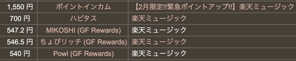 では、早速ポイントサイトの楽天ミュージック案件の相場を見ていくわけですが・・。