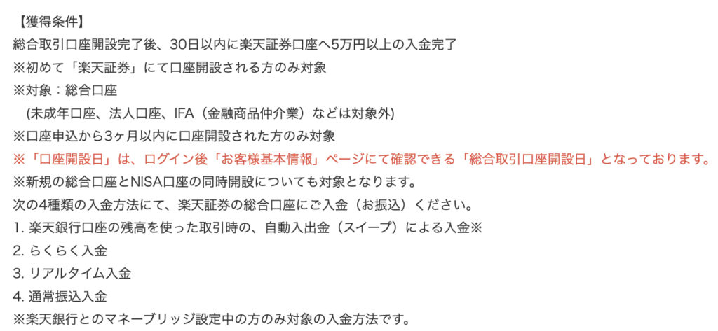 口座開設後、1か月(30日)以内に楽天証券の口座に5万円以上入金すればポイント獲得条件達成です。