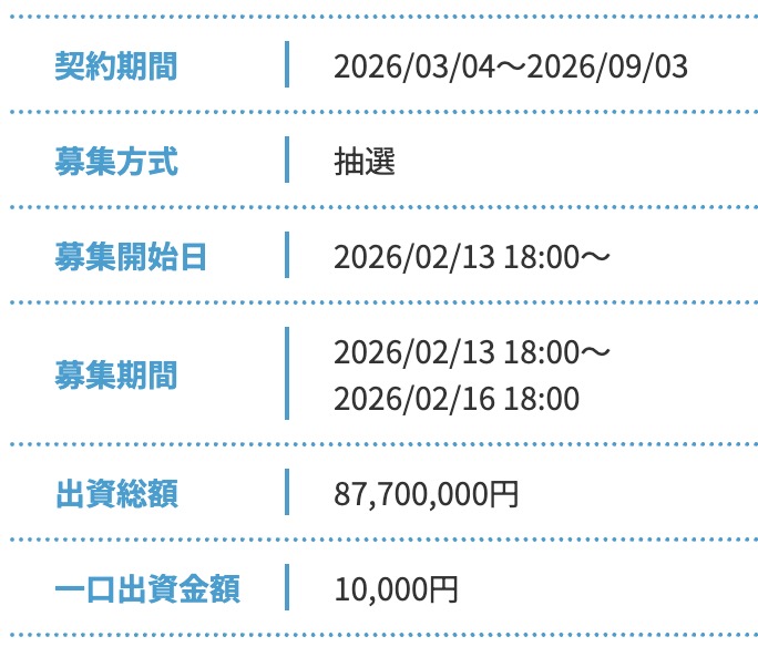 あ、直近の募集ファンド(2026年2月23日募集開始)も、抽選で運用期間6ヶ月、1口出資金額10,000円なのでご安心を。