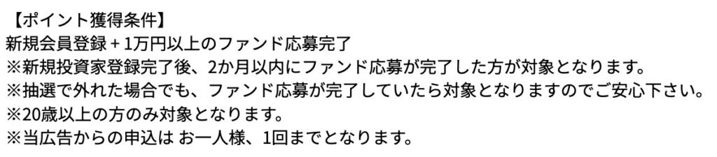 新規投資家登録完了後、2ヶ月以内にファンド応募が完了すればポイント獲得対象なんですが・・。