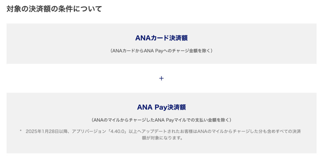 これは上記のとおり、ANAカードの決済額+ANA Payの決済額の合算が対象となります。(※ANAカードからANAPayへのチャージ金額を除く)